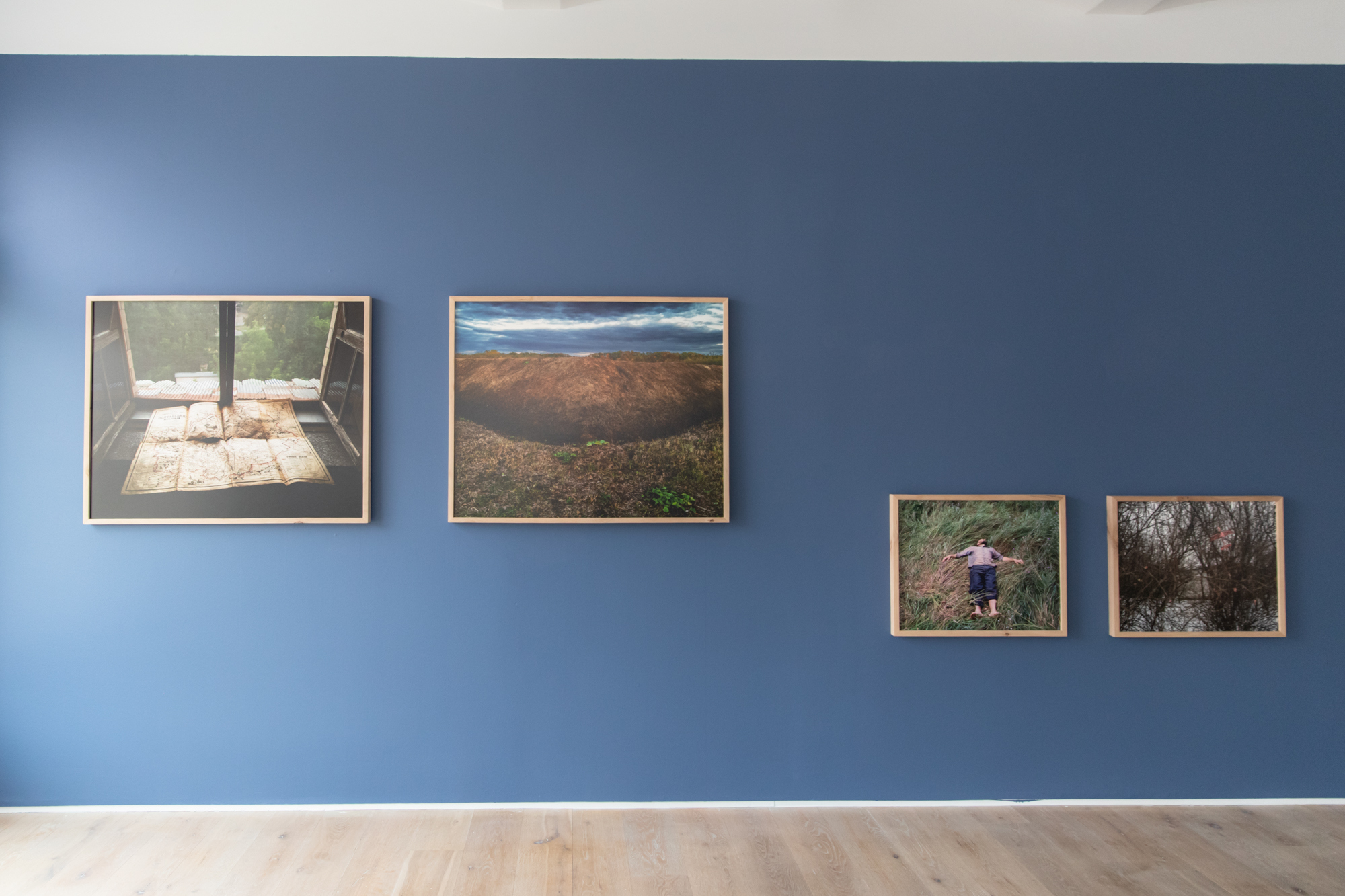 Poltava appears peaceful in the calm before the storm, but that perspective is tempered with the knowledge of the coming war. We can see the past and remember the present at the same time. Some of the image pairings in this particular show were chosen with that theme in mind. A man lying on the ground is placed next to an image of a toy plane caught in the branches of a tree. In one reality, the man could be in a state of wonder and abandon, perhaps dreaming about flight.