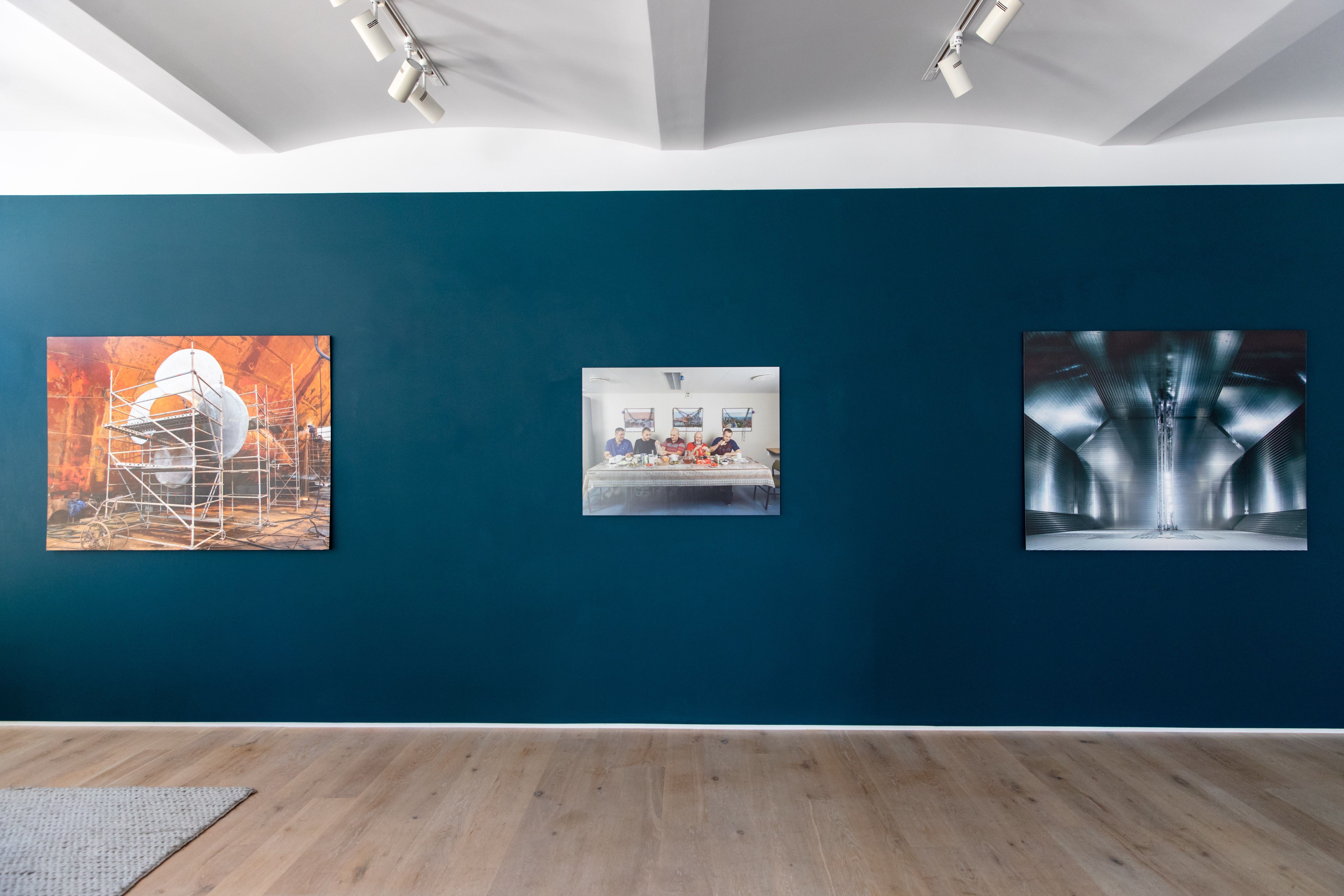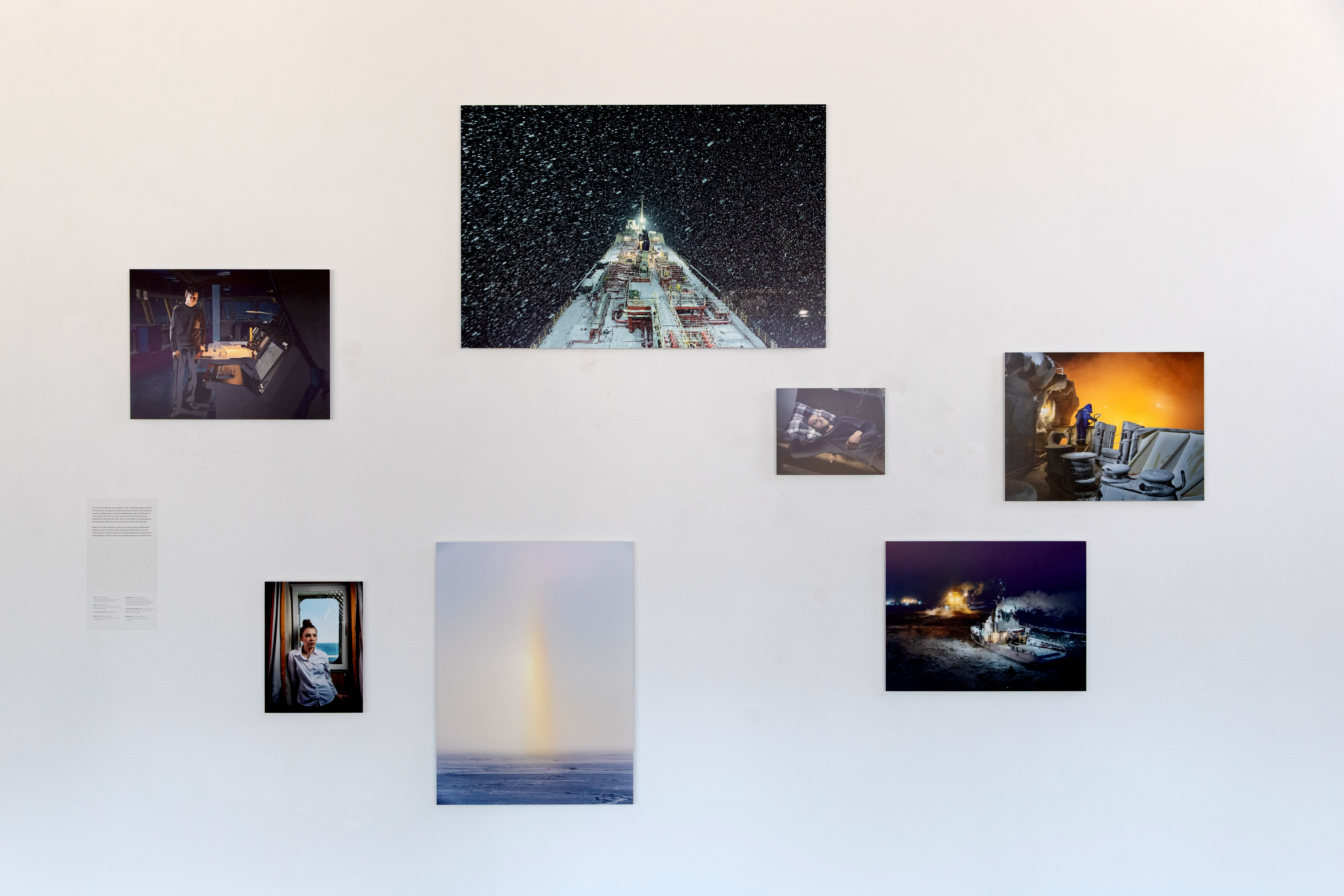 In this installation, portraits were kept small for a sense of scale, one where humans are vulnerable to the frozen ocean. They are dwarfed by the imposing machinery of the ships required to navigate it all.