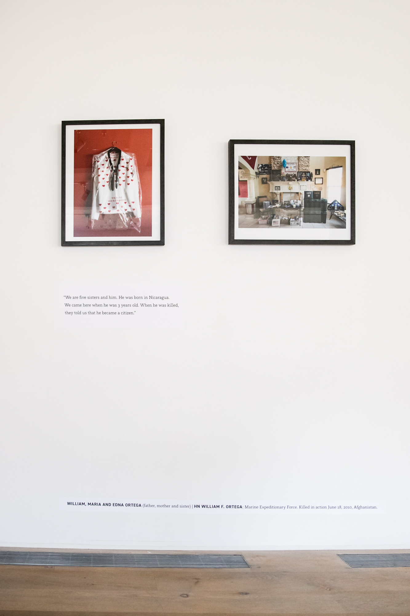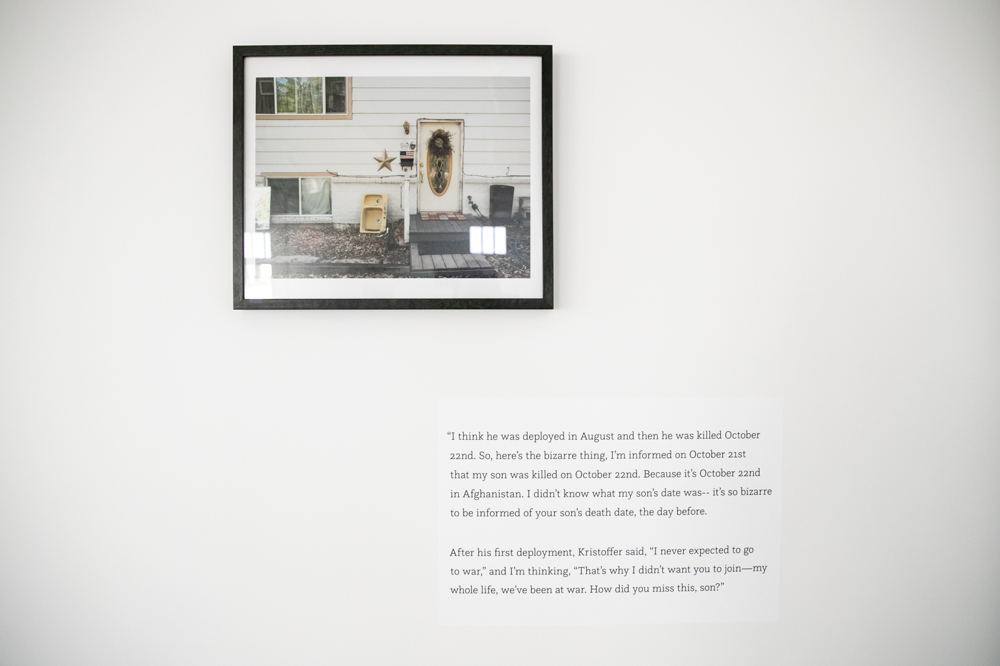 There is a knock on the door that military families hope to never receive. Notifiers arrive in pairs; one chaplain and one officer are tasked with bearing the most difficult news. Abergil has included their perspective, with large unflinching portraits that are interspersed between the family stories. Their bodies are poised in formal dress uniforms, but sorrow reflects back from their eyes. The images ask us to confront the faces that no parent wants to see. In the gallery, these portraits are larger than life size, as inescapable as the news they bear.